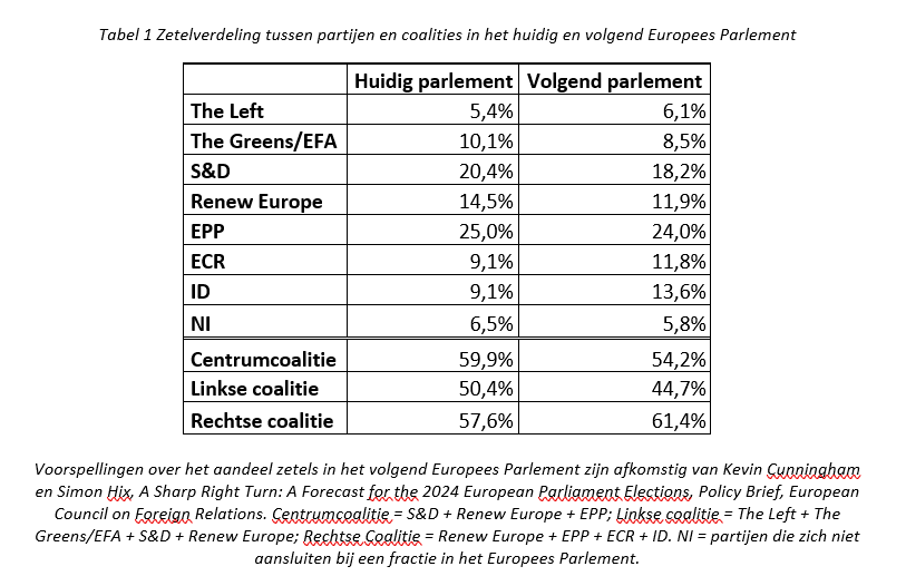 Volgens alle analisten die op basis van peilingen voorspellingen doen over de zetelverdeling in het volgende Europese Parlement komt er een stevige ruk naar rechts. Op The Left na staan alle linkse partijen op verlies en hun verloren zetels gaan integraal naar de rechtse Europese Conservatieven en Reformisten (ECR) en, vooral, naar de extreemrechtse Identity and Democracy (ID) fracties.