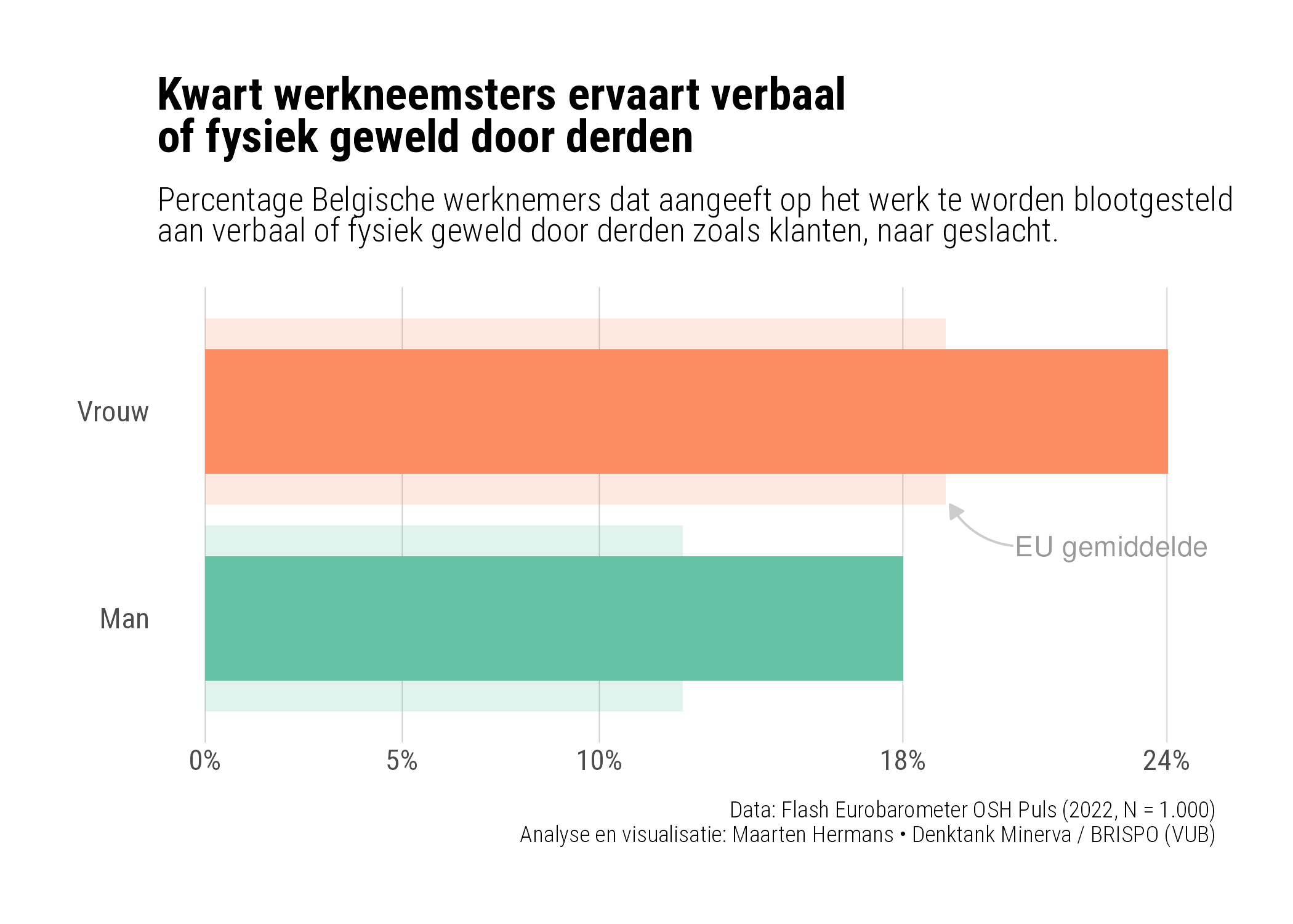 Zo geeft een op vier Belgische werkneemsters aan dat ze fysiek of verbaal geweld door derden heeft meegemaakt, bijvoorbeeld door klanten, studenten, patiënten, etc. (Figuur 1). Dit ligt gemiddeld hoger voor vrouwelijke dan voor mannelijke werknemers, en voor beide groepen ligt dit in België boven het Europese gemiddelde.