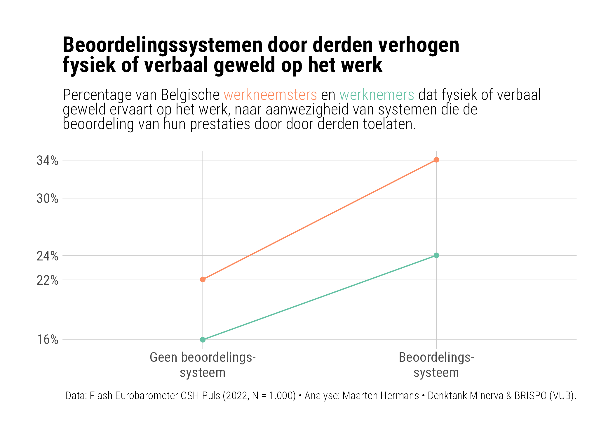 In organisaties waar de werkgeversystemen inzet om de presentaties van werknemers te laten beoordelen door derden, ervaren werknemers ook meer verbaal of fysiek geweld door derden (Figuur 2). Vrouwen ervaren met én zonder zulke systemen gemiddeld al meer geweld dan hun mannelijke collega's, voor beide groepen verhogen zulke systemen de blootstelling, en dit effect is licht sterker voor vrouwen. Maar liefst 34% van de vrouwelijke werkneemsters ervaart verbaal of fysiek geweld door derden op werkplekken waar deze hun presentaties kunnen beoordelen.