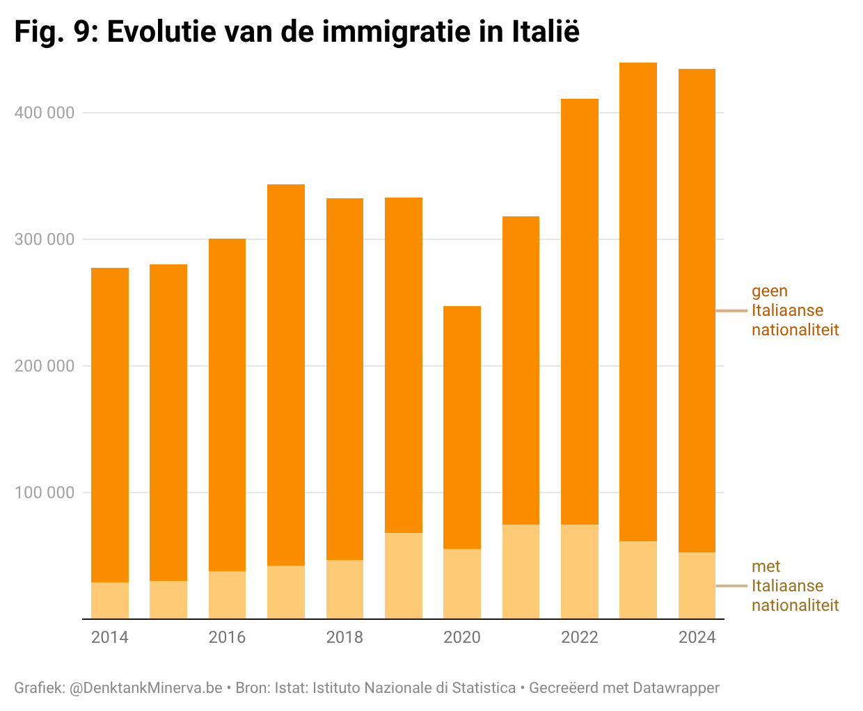 Gevolg is dat de officiële immigratiecijfers de afgelopen jaren onder de regering-Meloni niet zijn gedaald, maar net zijn blijven doorstijgen (zie: Figuur 9). In 2023 en 2024 schreven maar liefst 440.000 resp. 435.00 nieuwe burgers zich in het land in. De toename van het aantal migranten ten opzichte van 2022 is overigens uitsluitend terug te leiden tot een toename van de buitenlandse immigratie (+13% in de twee jaar ten opzichte van 2022), aangezien de ‘immigratie’ of ‘repatriëring’ van Italiaanse burgers net afnam onder Meloni (-23,6%).xlv