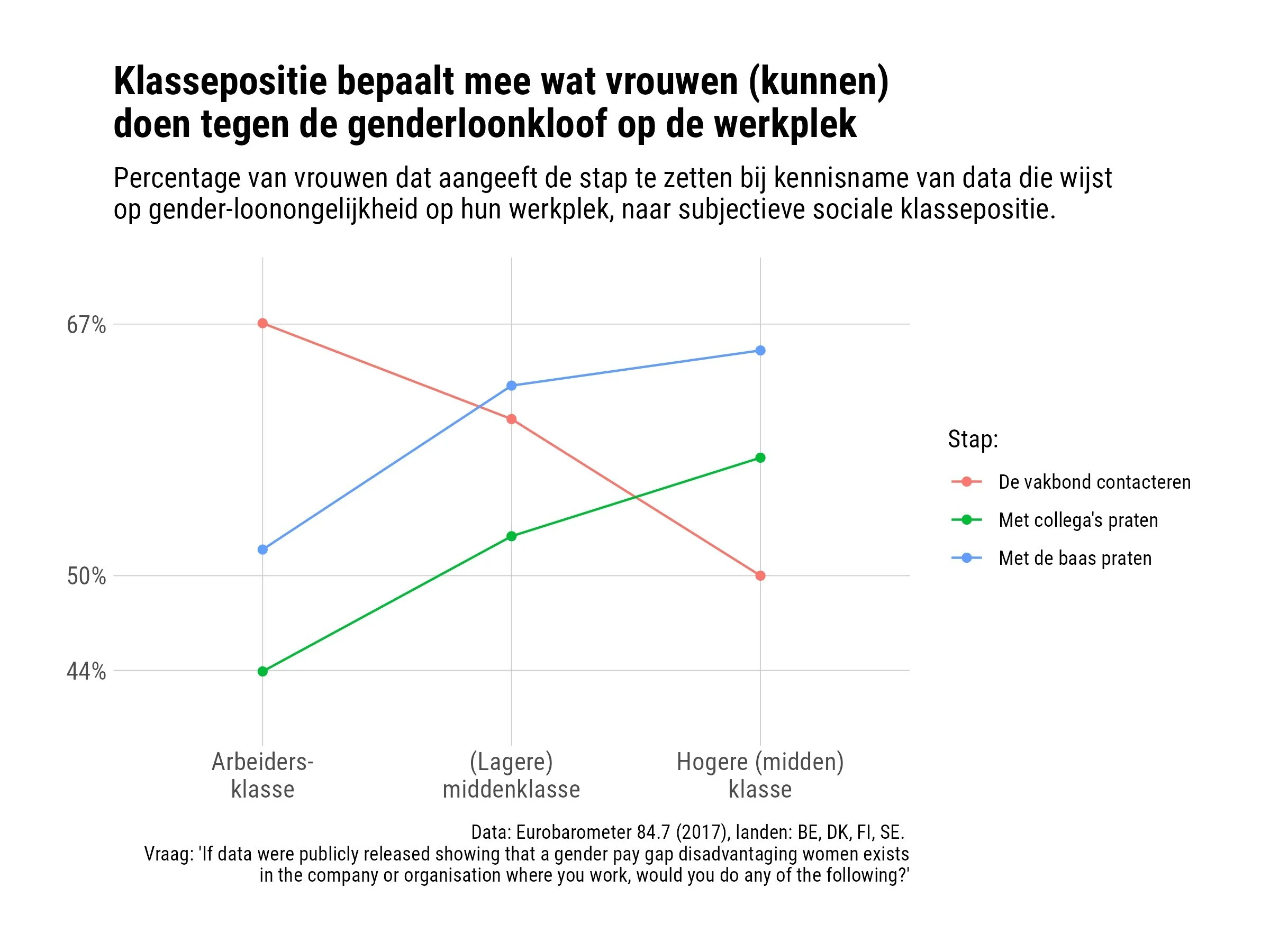 Dit zien we ook in Eurobarometer-bevragingen over de ervaringen van werknemers met loonongelijkheid. Op de vraag wat je zou doen als je info krijgt dat op je werkplek vrouwen minder betaald worden, zijn de drie meest voorkomende acties die Belgische vrouwen zouden nemen respectievelijk met hun baas gaan praten (50%), de vakbond contacteren (46%), en met de collega’s er over praten (42%).